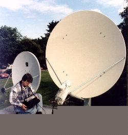 The Astra group of satellites (19 degrees east) transmit a very strong signal and so an 80cm dish is adequate for receiving purposes. That would be about the size of the small dish in the picture on the right. If you wanted multi-satellite reception you would need a motorised tracking system - 1.6metre dish would be recommended. This would be somewhere in the middle of the two dishes, sizewise. The big dish on the right is actually used for tranmitting up to the satellites, but that's another story!