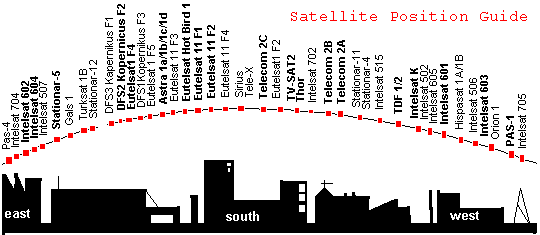 As you can see from the map above, there are many satellites transmitting television signals to every country in Europe. Listed are all the geastationary satelites that signals can be received from if you are in the east coast of Ireland. Some of the satellites are more powerful than others and require differant minimum sizes of dishes to obtain good picture quality.